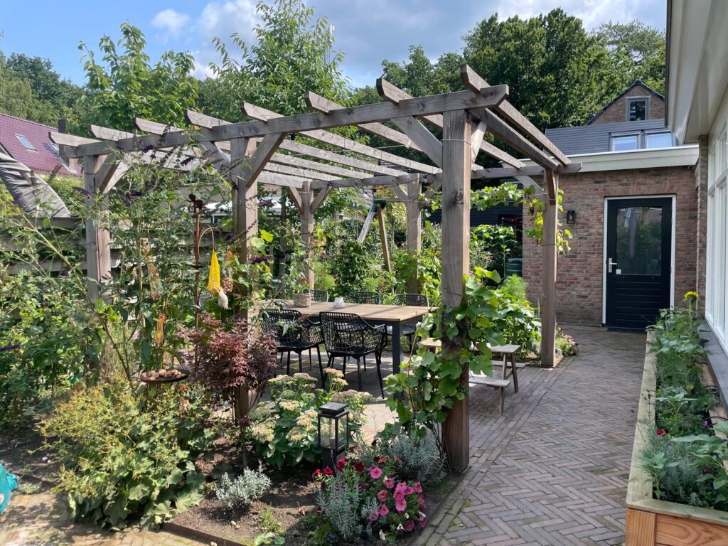 De tuin in Doorn, twee jaar na ontwerp, laat zien hoe het oorspronkelijke ontwerp met de beplanting en elementen, is uitgegroeid tot een harmonieuze verlengstuk van het huis.